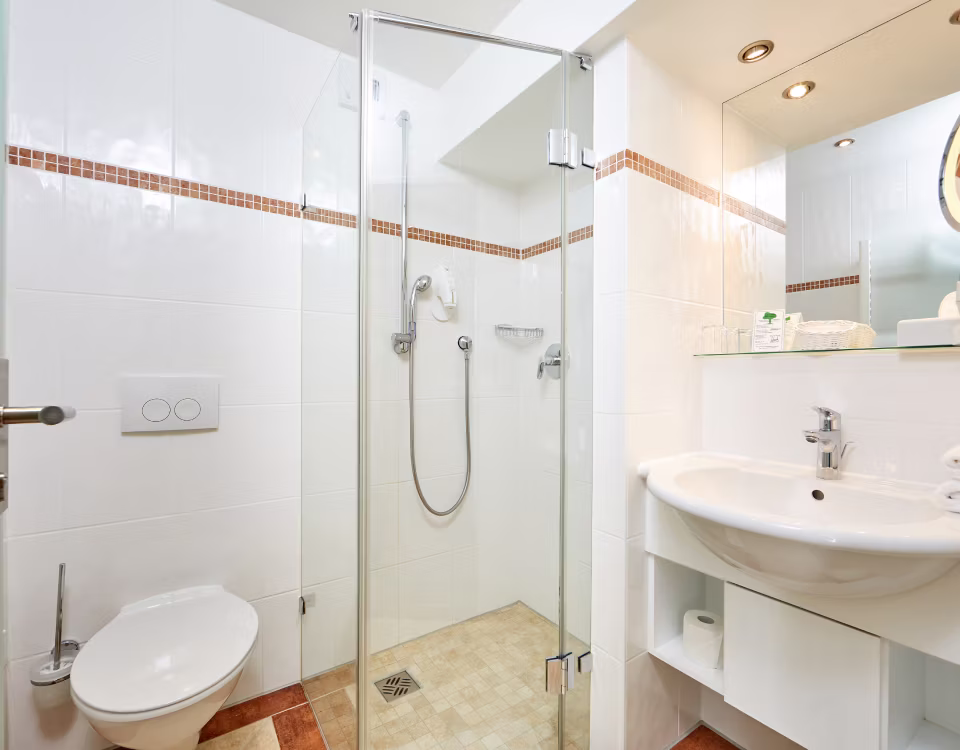 Whether warm and homely with the charm of old wood or quiet and elegant with a silky, elegant flair — in our comfort rooms in the country house, you can choose the style that suits you. Both variants invite you to arrive, relax and be completely at yourself. The rooms on the first floor are reminiscent of the cozy atmosphere of a Bavarian country house with burgundy striped interiors and wooden panelling. On the second floor, bright rooms with floral armchairs, natural white wallpaper and fresh, green accents await you. Everything here is designed for ease and relaxation.
