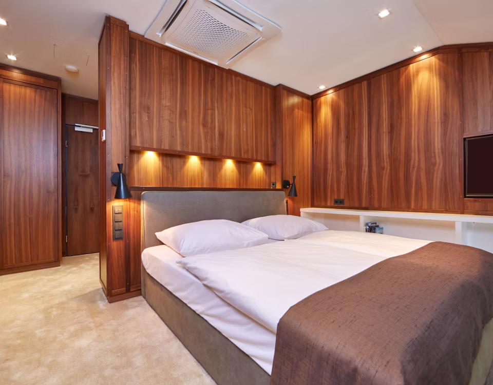 A glazed staircase leads up to the sleeping area. The large bed is designed so that when you wake up, you look directly at the lake. Up here too: another separate toilet and plenty of storage space without getting too tight. The suite is ideal for guests who consciously travel alone or as a couple. An extra bed is not provided. Of course, an in-room safe and free WiFi throughout the house are available.
